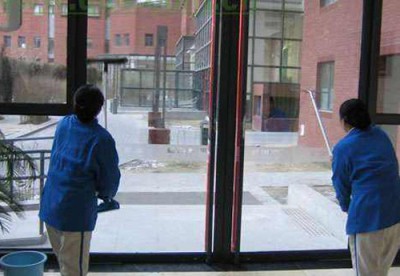3、擦玻璃:先用云石鏟刀和清潔球清除窗框和玻璃上頑固的污漬,然后用高壓噴瓶將配好的玻璃清潔劑溶液均勻的噴到玻璃上,第三,用百潔布把玻璃框擦拭干凈,第四,使用雙面玻璃清潔器將玻璃擦干凈,最后用玻璃刮將玻璃邊的水痕擦干